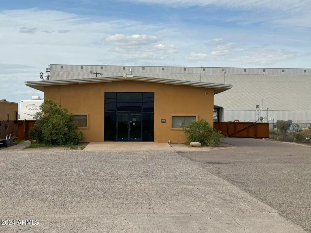 Great commercial property on 1.56 acres with 40 x 80 building. High traffic count Gila Bend Hwy. Fully Fenced. Past use Metal Fabrication shop. The metal building has a stucco finish, and a total of 3200 sq. ft. There is a nice office/reception area, an eating area, a 3/4 bathroom, and a private office. The rest of the building is used as Fabrication shop 40 x60. Plenty of parking outside with approximately 30 parking spaces in front. Enough land for another large building or other type of structure. Two Aluminum Covered awnings 30x50 and 14x30 are included. 50 amp full RV hookup. NOTICE Tools tables equipment and metal material in yard do not convey, also any autos, trucks or metal containers will be moved by owner before close of escrow.
