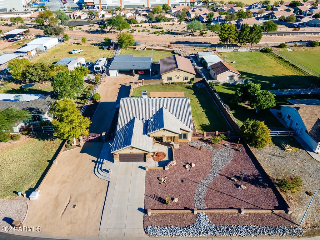 Discover Your Dream Home - A Rare Gem with No HOA! Welcome to this stunning 3-bedroom, 2-bath home w/ a den, boasting 2,106 sq. ft. of elegant living space on a sprawling .868-acre lot. Nestled in an exclusive & uniquely charming neighborhood, this property offers unparalleled convenience near the 101, I-10, and 303 freeways. Inside, custom finishes & high-end features abound. The chef's kitchen is a masterpiece w/ custom cabinetry, pull-out storage, a pot filler faucet, an ice machine, and even a stand mixer lift. The travertine & wood flooring add timeless sophistication throughout the home. The primary suite is a luxurious retreat with dual sinks, a soaking tub, a snail-style walk-in shower, dual walk-in closets, and a private patio entrance. The hall bath is ADA-compliant, with a custom-tiled walk-in shower for added convenience. Step outside to your entertainer's paradise! A spacious covered patio features a built-in BBQ, a misting system, an outdoor TV in a custom cabinet, and ample space to relax or host gatherings. The fully fenced backyard offers privacy, while the open space beyond enhances tranquility.