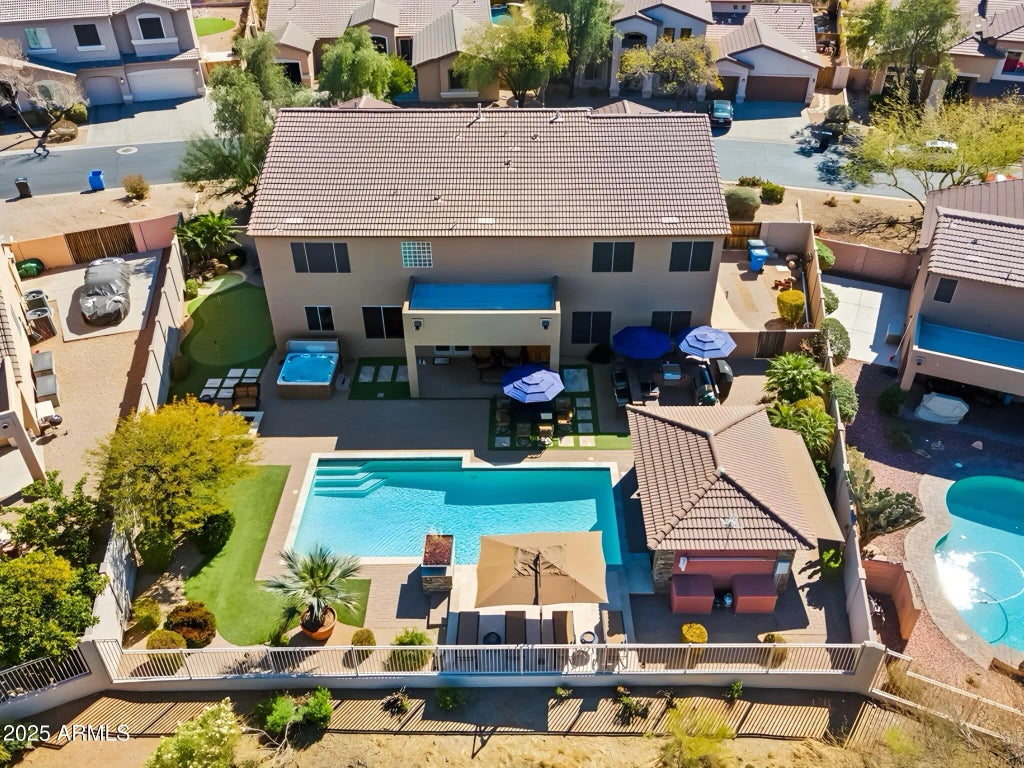 WOW Check out this homes AMAZING $/SQFT VALUE!! This amenity-rich home has been meticulously maintained! Offering 5 bedrooms, 3.5 bathrooms, and 4,865 sqft of living space, it boasts soaring ceilings over the formal dining and family room, an open and bright layout, an additional office/flex space, a vast bonus room, a convenient downstairs guest suite, and ample storage—overall perfect for entertaining. The backyard is a true showstopper, featuring a resort-style pool and above-ground spa, a full Ramada-covered bar, built-in outdoor kitchen/grill center, putting green, gas fire pit, and spacious side yards—all framed by a view fence with mountain views! & more to see! and MORE! To top it all off, enjoy serene mountain views, privacy, and peacefulness as the home backs to a desert belt with a view fence. In close proximity to community park, golf courses, shopping, dining, and more!