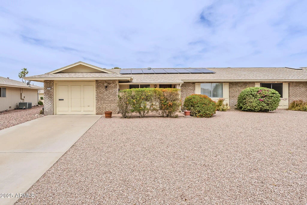 Immaculate Move-In Ready Condo/Twin Home! This beautifully maintained home offers 2 generously sized bedrooms, 2 spacious bathrooms, and a versatile 1.5-car garage—perfect for a vehicle and golf cart. Recent upgrades include a new A/C compressor (January, 2025), sleek stainless steel appliances, new carpeting, updated light fixtures, and low-maintenance desert landscaping in the front yard. Enjoy the open-concept great room and dining area, ideal for relaxing or entertaining. The tiled, screened-in back patio is perfect for enjoying peaceful evenings outdoors. Laundry is conveniently located in the garage. Personal property available under a separate bill of sale.