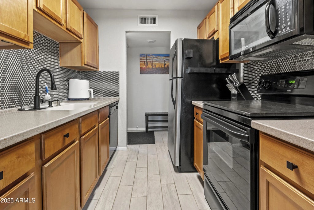 Enjoy Piestewa Peak views! Thoughtfully updated interior showcases stylish plank tile flooring, an elegant kitchen with modern countertops, a sleek penny tile backsplash, & newer appliance. Unique fixtures & fans add a contemporary flair. Step onto the inviting patio w/ lush turf, perfectly positioned to take in the complex, sparkling pool, & clubhouse w/ Workout Equipment. Recent upgrades including new windows & new roof. HOA is preparing to paint the exterior of the complex. Located close to restaurants, shopping, & fitness centers. Easy access to hiking, biking trails and the Arizona Canal. The pool was recently remodeled. Assigned covered parking & a secure gated entrance. Owner is open to a rate buydown, with an acceptable offer. You won't find a cuter place for the money!