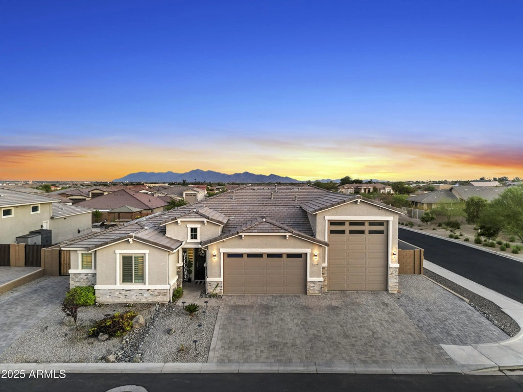 Welcome to your private paradise with resort style backyard in the desert! Modern style meets elegance in this functional, split primary floorplan. Attached MIL/Guest quarters with kitchenette, full ensuite bath and seperate exit to backyard-this space is perfect for mutigenerational living or guests accomodations. Kitchen features white cabinetry, designer backsplash, quartz countertops, SS appliances, walk in pantry and huge island. Plantation Shutters and mechanical roll up window coverings. Custom barn doors. Relax year round in your own private bakyard oasis with custom heated pool and spa. Ample space for toy storage-10 ft RV sidegate and massive RV garage This exclusive property is perfectly situated just minutes from AZ Cardinals stadium and vibrant Westgate Entertainment Distric Luxurious owner's suite with tiled walk in shower, dual vanities and his and hers walk in closets. Two generously sized bedrooms connected by a Jack and Jill bath. This premium north/south elevated, oversized corner lot provides space and privacy from neighbors. Pavered driveways. Low maintanece landscape with travertine paver walkways, artificial turf and misting system. Pool features baja shelf, stool seating, waterfall and LED lighting. Custom garage cabinets/workspace, LED lighting and RV garage equipped with 220 & 50 amp plugs. Onsite RV dump station. This home checks all the boxes-Luxury, lifestyle and location all come together here!