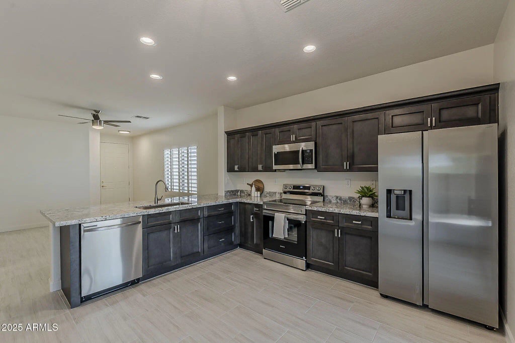 Everything here is new - the roof, the Trane AC, the flooring, the paint, the lighting, even the stainless appliances with the stickers still on. Step inside and it feels like a brand-new home from top to bottom. The kitchen steals the show: new designer shaker cabinets meet dazzling granite counters in a space that begs for a late-night snack or a weekend feast. Both bathrooms have been updated with cabinetry and comfort-height vanities. And then there's the setting: a private wash lot with a view of Daisy Mountain that makes every morning feel special. Move in, unpack, and enjoy the Anthem lifestyle in style.