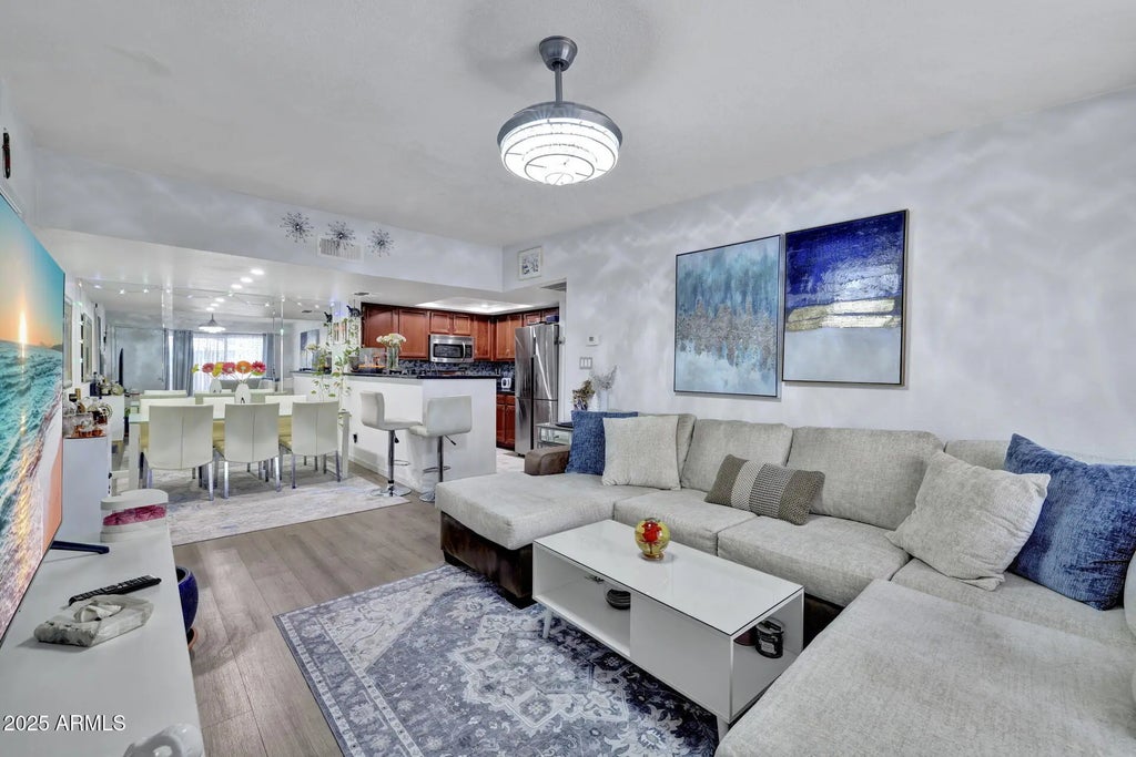 TROPHY PROPERTY FOR THE TAKING: PRIME LOCATION, plus POOL, add in a SPA, throw in the CLUBHOUSE then make this PRIVATE APARTMENT tastefully updated within feet of BANNER THUNDERBIRD HOSPITAL and ARIZONA STATE UNIVERSITY WEST. WE HAVE IT ALL! Situated alongside a GREENBELT spanning for miles, the RECREATION, FRESH AIR, ACTIVITIES are limited only by ones imagination. Travel WEST 4 minutes by car takes you to ASU WEST. Whether FACULTY or STUDENT the location offers CONVENIENCE and AFFORDABILITY. It doesn't matter what night of the week it is, there's ALWAYS SOMETHING COOKING around the corner. Whether ITALIAN, a TASTE OF THE SOUTHWEST or maybe THE SPICERY, SUSHI? Not to worry, you've got OPTIONS! SOMETIMES ALL THE VARIABLES LINE UP and with this SPACIOUS CONDOMINIUM, THEY SHOUT THIS IS IT! MODERN UPGRADES: As you step inside, you'll be greeted by a spacious kitchen with UPGRADED CHERRY CABINETS, elegant GRANITE COUNTERTOPS, and BRAND NEW APPLIANCES. Whether you're a culinary enthusiast or just love to entertain, this kitchen is designed for you! The condo has been thoughtfully updated with: Removed popcorn ceilings for a sleek look Stylish laminate flooring throughout Recessed lighting that brightens every corner A stunning chandelier in the living room for an elegant touch Cozy lighting in the bedrooms and bathrooms for a warm atmosphere Plus, enjoy the convenience of a new laundry area door and a state-of-the-art security system for peace of mind.