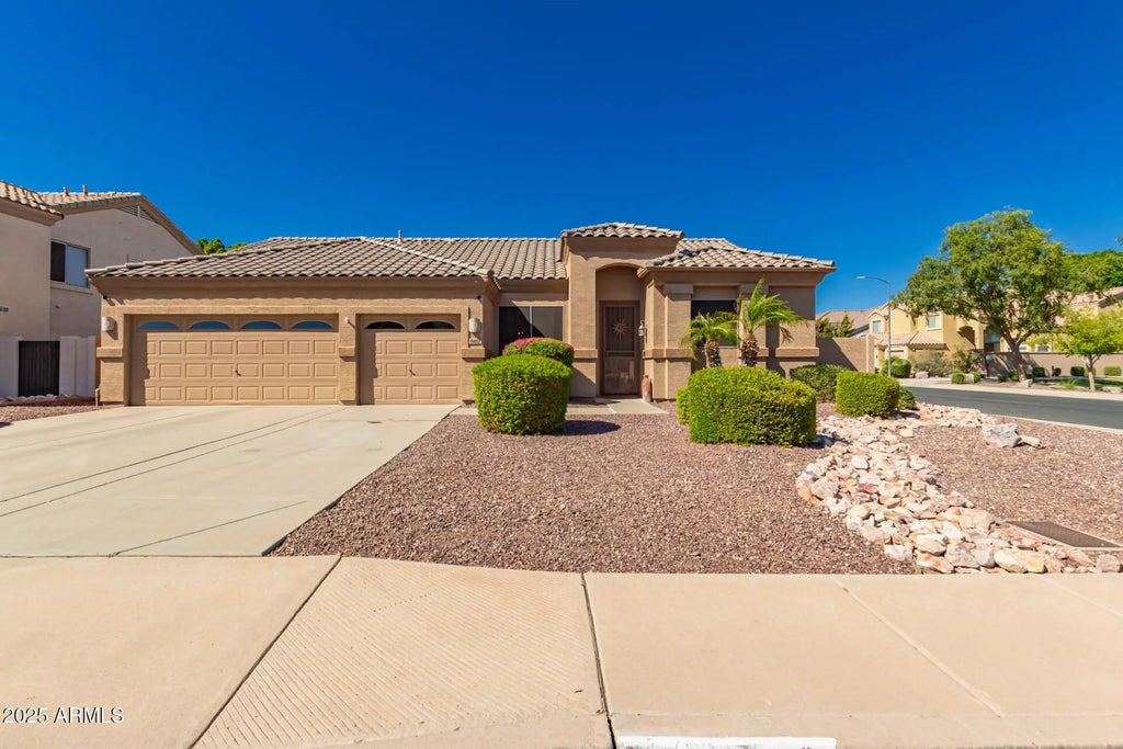 Welcome to the desirable Touchstone Community, centrally located in the heart of Glendale! This stunning single-level home offers a bright and open floor plan with high ceilings, recessed lighting, ceiling fans, and large windows that fill the living and dining areas with natural light. The well-appointed kitchen features an electric range, microwave, dishwasher, refrigerator, full backsplash, and a high breakfast bar ideal for high stool seating. The great room boasts a beautiful stone fireplace with hearth, built-in shelving, and tile plank flooring. A versatile flex room with double doors, ceiling fan, and plank tile flooring is perfect for a home office or can easily be converted into a fourth bedroom. The primary suite includes a walk-in closet, dual sink vanity, jacuzzi tub, step-in shower, and a bright window with blinds. Secondary bedrooms are generously sized with ceiling fans, closets, and carpet. A beautifully updated hall bath showcases a single sink vanity, frameless glass step-in shower, and floor-to-ceiling stone tile. Additional conveniences include a half bath, large laundry room with storage, and direct access to a spacious three-car garage with extended driveway. Step outside to your tropical backyard oasis featuring a sparkling pool with Baja step, covered patio, artificial turf, surfboard-accented block wall, cafe ambiance lighting, and two storage sheds. Situated on a corner lot with low-maintenance front yard river rock landscaping, this home is move-in ready. Enjoy the Touchstone Community amenities, including expansive park areas, volleyball courts, playground, and more! This home truly has it all.