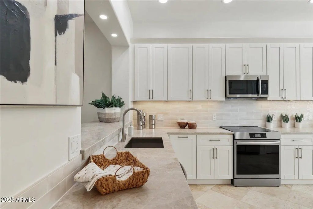 **REMODELED** NEW interior paint-NEW kitchen cabinets-NEW quartzite countertops-NEW appliances-NEW baths! This feels like a NEW HOME and is available to move into now - all the work has been done - lock and leave! Tile Roof Warranty to 2034-NEW AC in 2021 w/warranty. This single-story townhouse villa w/stone floors thru-out and 10' ceilings offers a spacious great room w/2-way gas fireplace, an expanded patio door to bring the outside in, updated kitchen w/breakfast bar & roomy breakfast nook, 2 bedrooms-split for privacy and an office or 3rd bedroom. Laundry room w/NEW washer & dryer and cabinets. The outdoor patio extends your living area with open desert behind for total privacy. This desirable location has hiking trails and Eagle Mountain Golf Club & Grille is 5 minutes away.