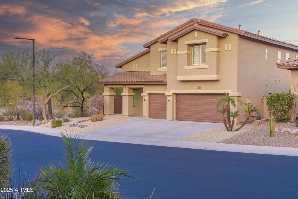 Premium cul-de-sac location with only one neighboring home** 5 bedroom, 3.5 bath home in the desirable Sonoran Mountain Ranch community of North Peoria**This spacious residence offers thoughtfully designed layout, featuring formal living & dining, welcoming family room off the kitchen & bright eat-in breakfast nook**Primary Suite downstairs is a true retreat, complete with a cozy sitting area with direct access to the backyard**Upstairs offers 4 additional bedrooms, 2 bathrooms with a large game room/family room and separate loft. Built-in cabinets and desks are great for office/study area**Step outside with no neighbors behind you, enjoy unobstructed mountain views from your private oasis, featuring a play pool and above ground jacuzzi **custom built shed and shelving in the 3 car garage provide extra storage**New Exterior Paint Stucco (2024), New AC units (2020), New sprinkler system (2022), Pool Pump (2022), Spa Heater (2022), **Mountain Trails and park are within walking distance**